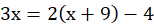 A.Równanie 3x = 2(x+9) – 4 opisuje treść zadania.