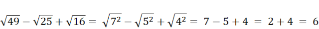 Najpierw liczymy wartości wszystkich podanych pierwiastków (aby to zrobić szukamy liczby, która podniesiona do drugiej potęgi da nam liczbę pod pierwiastkiem). Następnie odejmujemy i dodajemy otrzymane liczby.