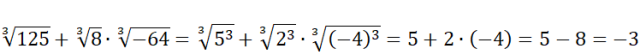 Aby obliczyć pierwiastek trzeciego stopnia z danej liczby musisz znaleźć taką liczbę, która podniesiona do trzeciej potęgi da liczbę pod pierwiastkiem. Znajdź te liczby, a następnie pamiętając o kolejności działań oblicz wartość wyrażenia.
