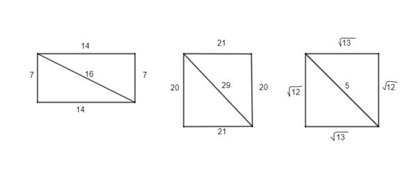 Jeżeli długości boków w trójkącie prostokątnym spełniają twierdzenie Pitagorasa, wtedy są podane poprawnie. Tylko w prostokącie II i III podano poprawne długości boków.