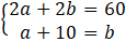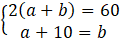 Na początku musisz zapisać pierwsze równanie, w którym obwód prostokąta (L = 2a + 2b) wynosi 60. Drugim równaniem będzie to, że bok a powiększony o 10 stanowi bok b.