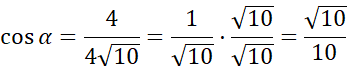Cosinusem kąta α nazywamy stosunek długości przyprostokątnej leżącej przy kącie α do długości przeciwprostokątnej.
