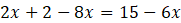 Mamy równanie 2(x + 1) – 8x = 3(5 -2x). Która z trzech liczb: 2, 3, 4, spełnia to równanie.