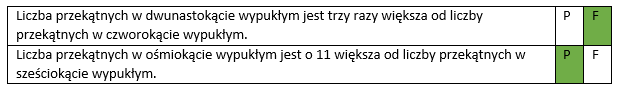 | Liczba przekątnych w dwunastokącie wypukłym jest trzy razy większa od liczby przekątnych w czworokącie wypukłym. | P | F |