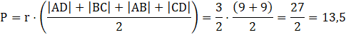 Oblicz pole czworokąta ABCD, jeżeli jest opisany na okręgu o średnicy 3 cm, gdzie |AD| = 4 cm, |BC| = 5 cm.