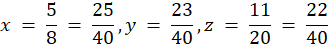 Dla każdej z osi liczbowych wyznacz długość jednego „odcinka” i odczytaj wartości liczb x, y i z, a następnie sprowadź je do wspólnego mianownika.