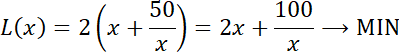 Najpierw podaj założenia dotyczące długości boków prostokąta x, y. Następnie wyznacz funkcję celu, czyli zależność obwodu od tych długości, która dąży do MIN. Kolejno wyznacz pochodną tej funkcji i wyznacz jej miejsca zerowe, a następnie określ znak tej pochodnej. Na tej podstawie określ przedziały monotoniczności i wskaż długość boku tej figury, dla której osiąga ona najmniejszy obwód. Następnie wyznacz długość y, i zauważ, że skoro jest ona taka sama jak x, to szukany prostokąt to kwadrat.