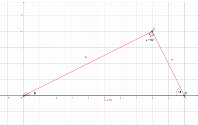 Narysuj w układzie współrzędnych trójkąt o podanych wierzchołkach. Oblicz przyprostokątne a i b z twierdzenia Pitagorasa. Teraz wyznacz sinusy kątów alfa i beta – sinus to stosunek przyprostokątnej leżącej naprzeciw kąta do długości przeciwprostokątnej. Oblicz iloczyn (wynik mnożenia) tych sinusów.