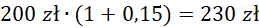 Oblicz cenę towaru, wiedząc, iż tę podniesiono o 15%, a przed podwyżką towar kosztował 200 zł.