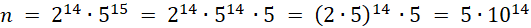 Mamy pojedynczą cyfrę oraz 14 zer z potęgi liczby 10. Łącznie mamy 15 cyfr.