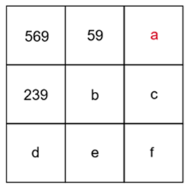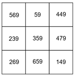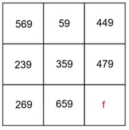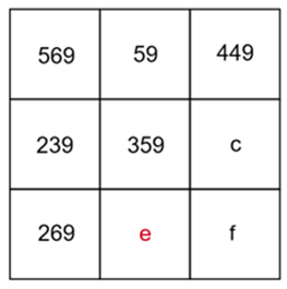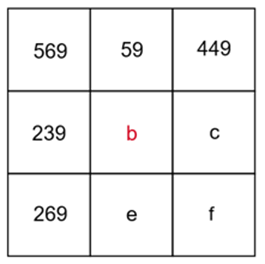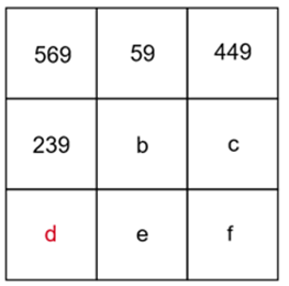 Znaki zapytania w podanym kwadracie uzupełnij dowolnymi różnymi literami. Skorzystaj z tego, że suma liczb w każdej kolumnie, wierszu i na przekątnej wynosi 1077. Na tej podstawie wyznacz brakującą liczbę w każdej linii, w której dwie już są podane. Postępuj tak, aż wyznaczysz wszystkie brakujące liczby w podanym kwadracie.