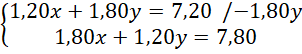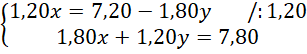 Ustal, ile jabłek ile bananów kupiła Krysia, jeśli na straganie można kupić banany i jabłka, jedno jabłko kosztuje 1,20 zł, a jeden banan 1,80 zł. Krysia kupiła kilka owoców i zapłaciła 7,20 zł. Piotr kupił tyle samo bananów, ile Krysia jabłek, i tyle jabłek, ile Krysia bananów, a za zakupy zapłacił 7,80 zł.