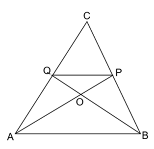 Odcinki AP i BQ są środkowymi trójkąta, więc punkty P i Q są środkami boków BC i AC. W trójkącie odcinek łączący środki dwóch boków jest zawsze równoległy do trzeciego. Więc:
