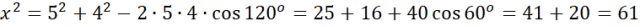 Oblicz długość trzeciego boku tego trójkąta, jeśli dwa boki trójkąta mają długości 5 i 4, a kąt między nimi ma miarę