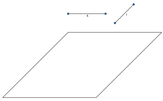 Wykonaj rysunek (lub zbuduj model) płaszczyzny równoległej do obydwu tych prostych i nieposiadającej z nimi punktów wspólnych. Czy przez każdy punkt przestrzeni nienależacej do żadnej z tych prostych można poprowadzić taką płaszczyznę? Jeżeli tak, to ile jest taki płaszczyzn przechodzących przez dany punkt, jeśli dane są dwie prostej skośne i .