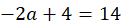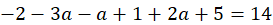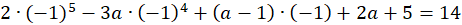 Oblicz wartość zmiennej a podstawiając -1 do wielomianu i przyrównując go do 14. Oblicz współczynniki wielomianu podstawiając wyliczoną wartość a.