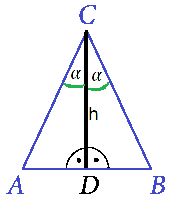 Dwusieczna dzieli kat na równe kąty, natomiast wysokość pada pod kątem prostym. Trójkąty ACD i CBD mają: kąt prosty, wspólną wysokość, kąt α – jest to cecha przystawania kąt – bok – kąt dla trójkątów, zatem długości ich boków są takie same. Oznacza to, że ramiona trójkąta ABC są równe.