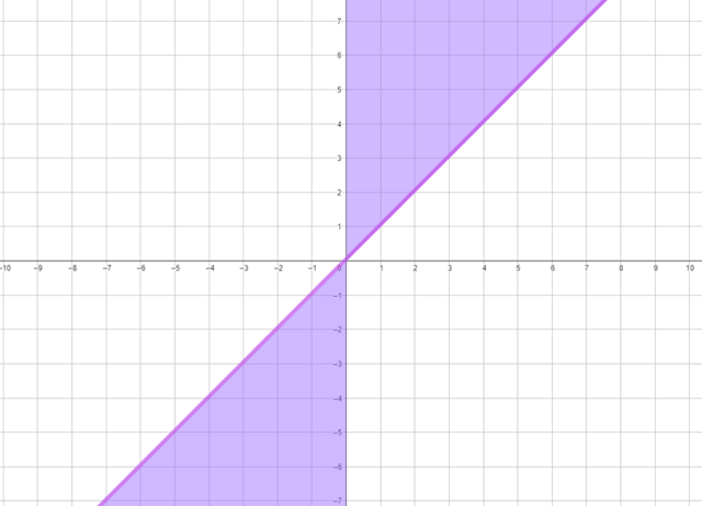 . Pamiętaj, że wszystkie takie funkcje przechodzą przez punkt (0,0). Będą to funkcje rosnące, ale o współczynniku kierunkowym większym bądź równym 1 (stąd ciągła linia w miejscu, gdzie przechodzi funkcja