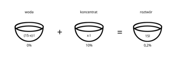 Na początku oblicz, ile litrów potrzebne jest na 3–krotne napełnienie opryskiwacza. Woda ma stężenie 0%, koncentrat 10%, a roztwór 0,2%. Utwórz równanie i oblicz koncentratu jest potrzebne.