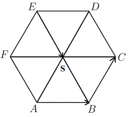 Punkt S jest punktem przecięcia przekątnych AD, EB i FC sześciokąta foremnego ABCDEF. W tym zadaniu musisz znaleźć na rysunku takie same wektory jak