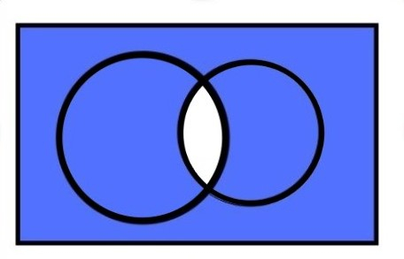 Kolorem niebieskim zaznaczono wskazany zbiór, czyli sumę dopełnień zbiorów A i B (przestrzeń dokoła obu okręgów).