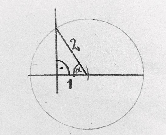 Aby skonstruować podany kąt narysuj dwie proste prostopadłe do siebie. Następnie skorzystaj z podanego cosinusa, odmierz na odpowiednim odcinku znaną długość boku i wyznacz okrąg o promieniu równym długości przeciwprostokątne. Punkt przecięcia z odcinkiem wyznaczy ostatni wierzchołek trójkąta.