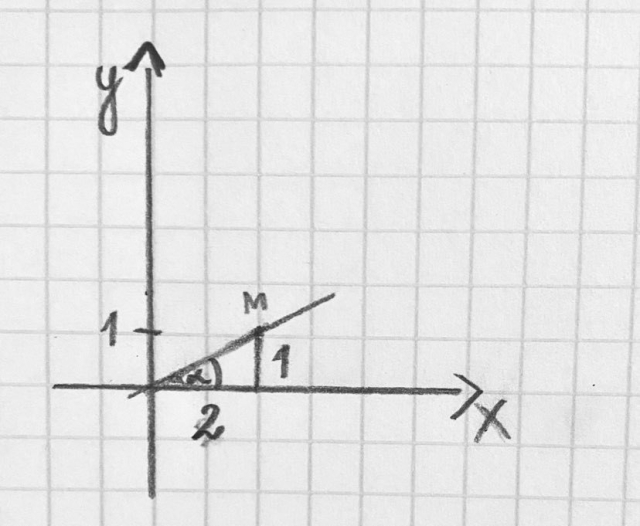 W tym zadaniu wyznacz tangens kąta ostrego α, który znajduje się między prostą przechodzącą przez punkt (0, 0) układu współrzędnych i M = (2, 1), a osią x.