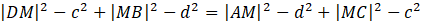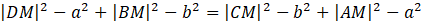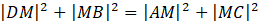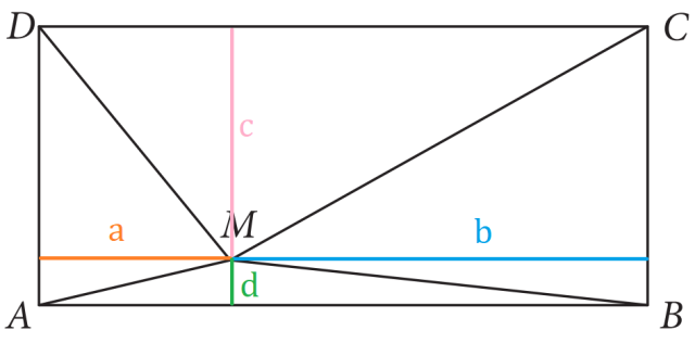 Na rysunku przedstawiono prostokąt ABCD, w którym zaznaczono punkt M. Twoim zadaniem jest wykazać, że |𝐴𝑀|2 + |𝐶𝑀|2 = |𝐵𝑀|2 + |𝐷𝑀|2.