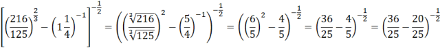 Oblicz wartość podanego wyrażenia. Pamiętaj, że przy podnoszeniu liczby do potęgi ułamkowej należy podnieść ją do potęgi równej liczbie w liczniku oraz spierwiastkować pierwiastkiem o stopniu równym liczbie w mianowniku wykładnika potęgi. Pamiętaj również, że przy podnoszeniu liczby do potęgi ujemnej należy ją odwrócić.