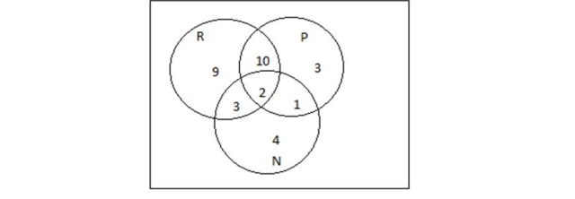 Zbiór R to zbiór ludzi jeżdżących na rowerze, zbiór P to zbiór ludzi pływających, a zbiór N to zbiór ludzi jeżdżących na nartach. Odczytaj z rysunku pomocniczego ile osób znajduje się w części wspólnej pływania i jeżdżenia na nartach i jednocześnie nie znajduje się w części osób, które jeżdżą na rowerze. Jest to jedna osoba.