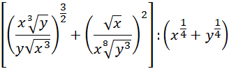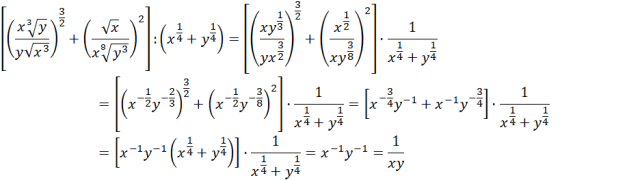 Określ założenia, pamiętaj, że liczba w mianowniku nie może być równa 0 lub jeśli jest w nim pierwiastek parzystego stopnia, to musi być on większy od 0. Potem przekształć ułamki na potęgi. Następnie uprość podane wyrażenie. Podziel potęgi w obydwu ułamkach, dzielenie potęg o takich samych podstawach można potraktować jako różnicę ich wykładników. Następnie podnieś powstałe liczby do podanych potęg. Zauważ, że z liczby