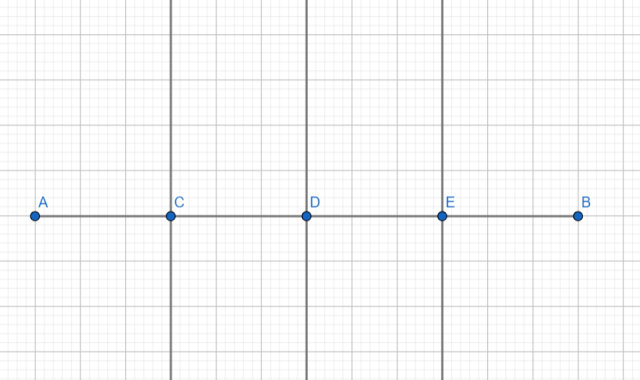 Narysuj dowolny odcinek i podziel go konstrukcyjnie na cztery równe części.