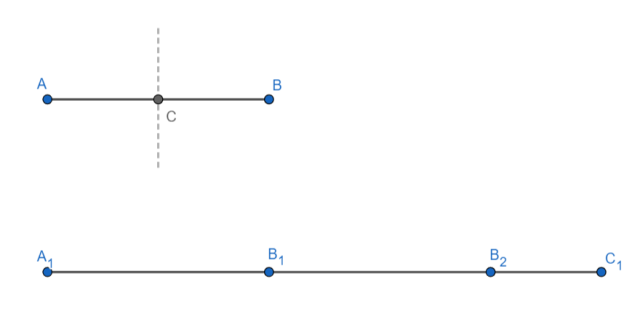 2. Ustaw szerokość cyrkla na ponad połowę odcinka AB. Narysuj okręgi w punkcie A i B. Ustal punkty przecięcia się okręgów nad i pod odcinkiem. Połącz te odcinki, tak by powstały odcinek przeciął prostą AB. Powstały odcinek przeciął prostą AB pod kątem prostym w punkcie C.