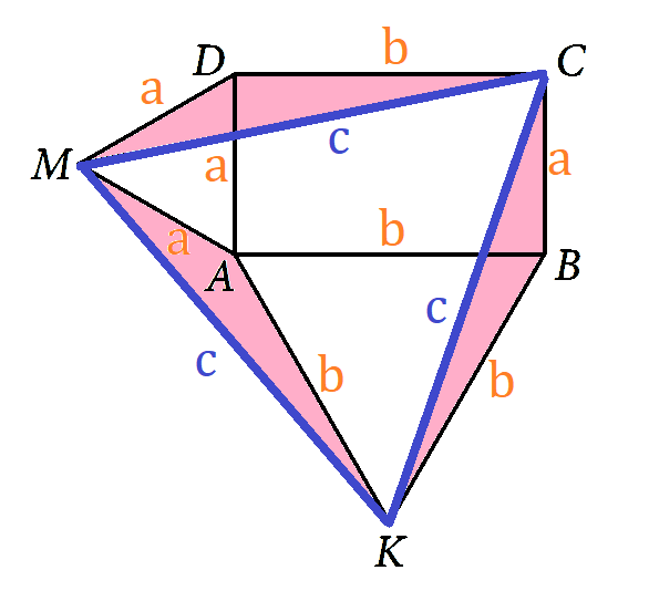 Trójkąty: CBK, MAK, MDC są przystające – mają boki o długości a i b, a także takie same kąty pomiędzy tymi bokami. Oznacza to, że ich trzeci bok musi być taki sam.