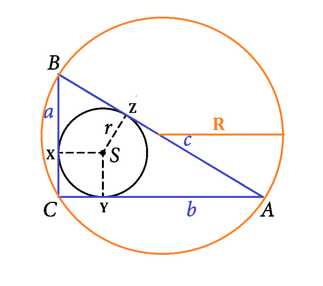 Masz podany trójkąt prostokątny, w którym: 𝑎 i 𝑏 — długości jego przyprostokątnych, 𝑐 — długość przeciwprostokątnej, 𝑟 — promień okręgu wpisanego w ten trójkąt, 𝑅 — promień okręgu opisanego na tym trójkącie. Twoim zadaniem jest udowodnienie zależności: .
