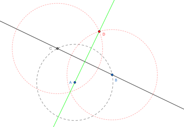 3. Punkty przecięcia się okręgów z punktu 2 oznacz D. Poprowadź prosta przechodzącą przez A i D. Otrzymana prosta jest prostopadła do prostej k.