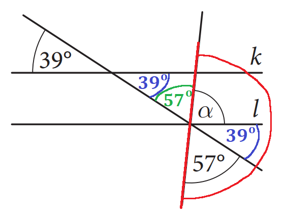 Masz wykazać, że 𝛼 = 84°, wiedząc, że proste 𝑘 i 𝑙 są równoległe.