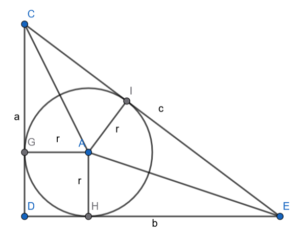 Udowodnij, że , jeśli w trójkącie prostokątnym i oznaczają długości jego przyprostokątnych, oznacza długość przeciwprostokątnej, – promień okręgu wpisanego w ten trójkąt, – promień okręgu opisanego na tym trójkącie.