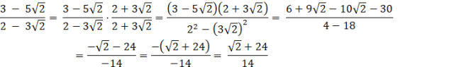Aby uzyskać odpowiedź, ułamek musisz wymnożyć przez drugi ułamek, który w liczniku i mianowniku będzie miał liczby z mianownika pierwszego ułamka, ale z przeciwnym znakiem. Jest to równoznaczne z mnożeniem przez 1, jednak po wymnożeniu mianowników pozbędziesz się niewymierności.