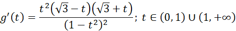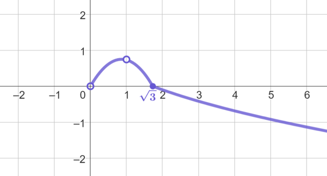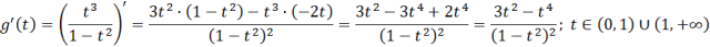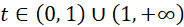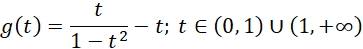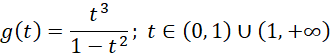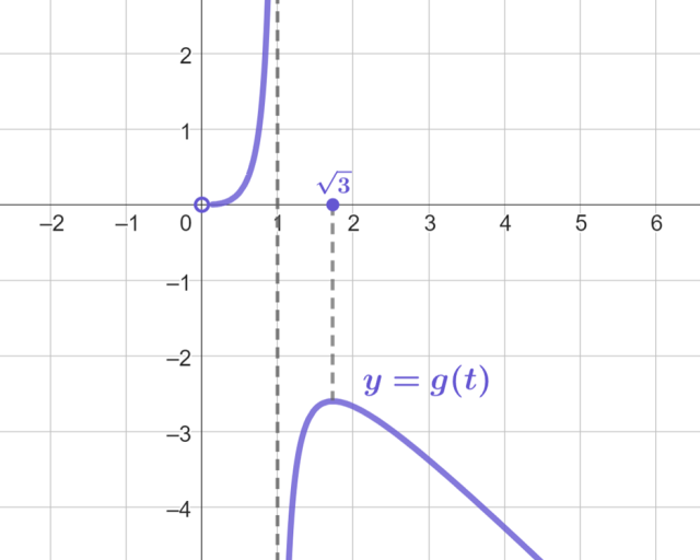 Ze wzoru funkcji g wiadomo, że w punkcie t = 1 znajduje się pionowa asymptota. Wykres pochodnej pozwala stwierdzić, że funkcja g rośnie w przedziałach (0, 1) oraz