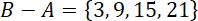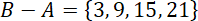 Twoim pierwszym zadaniem jest wyznaczenie zbioru B. Zbiór B to zbiór liczb różniących się od siebie o 3. W miejsce wielokropka wpisz brakujące elementy. Następnie Twoim zadaniem jest wyznaczenie różnicy zbiorów A – B. Musisz ze zbioru A usunąć wszystkie elementy, które znajdują się w zbiorze B. Po wykonaniu tej operacji zauważ, że różnicą tych zbiorów jest zbiór pusty. Wszystkie elementy, które były w zbiorze A znajdowały się również w zbiorze B. Po ich usunięciu w zbiorze A nie został żaden element. Kolejny krok to wyznaczenie różnicy zbiorów B – A. Ze zbioru B usuwasz wszystkie elementy zbioru A. Po wyrzuceniu wszystkich elementów zbioru A ze zbioru B pozostaje nam zbiór