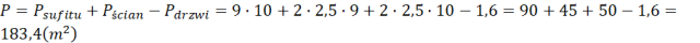 Oblicz pole powierzchni, którą trzeba pomalować jako sumę pól ścian i pola sufitu. Od tej sumę odejmij powierzchnię drzwi, które nie będą malowane. Zwróć uwagę, że pytanie w zadaniu jest o malowanie dwukrotne, pomnóż więc otrzymaną powierzchnię przez 2. Następnie podziel przez metraż, na jaki wystarcza 1 l farby. Na koniec określ, ile puszek o pojemności 5 litrów należy kupić, pamiętając, że można kupić jedynie pełne puszki.