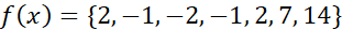 | f(x) | 2 | -1 | -2 | -1 | 2 | 7 | 14 |