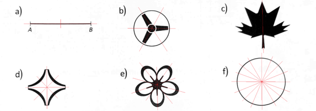 Aby podać ilość osi symetrii, najlepiej narysować je na rysunku. Po obu stronach prostej muszą znajdować się takie same połowy figury. Na rysunku f) zaznaczono tylko część z osi symetrii koła. W rzeczywistości ta figura posiada ich nieskończenie wiele.