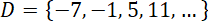Wypisz elementy zbioru D, czyli liczby całkowite podzielne przez 6 z resztą 5, przy czym najmniejsza z tych liczb ma postać 6k + 5 dla k = –2, czyli –7.