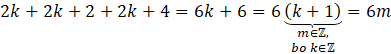 Liczbę parzystą zapisz jako 2k, gdzie k oznacza liczbę całkowitą, a następnie wyznacz sumę trzech kolejnych takich liczb. Sprawdź następnie, czy można ją przedstawić w postaci 6m.