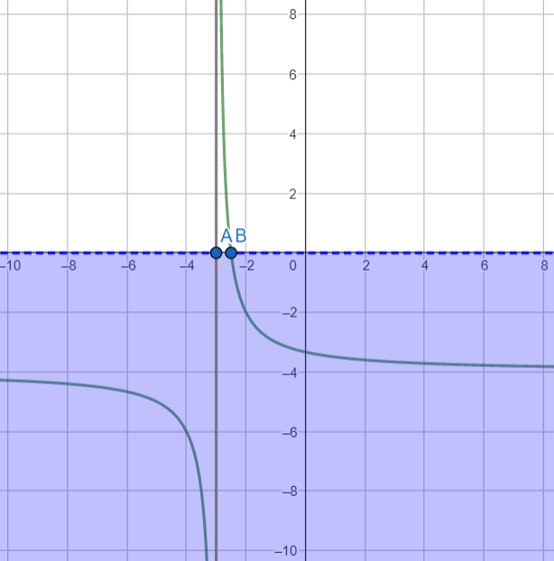 Narysuj wykres o powyższej funkcji. Zaznacz pionową asymptotę (x=3) oraz punkt przecięcia wykresu z osią OX (B). Wynik to wartości na niebieskim obszarze, należące do funkcji.