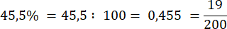 Przekształć daną wartość procentową na jej równoważną wartość jako ułamek dziesiętny oraz na nieskracalny ułamek zwykły: 45,5%