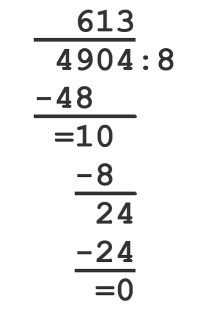 4904 : 8 = 613 r 0