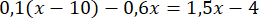 0,1x – 1 – 0,6x = 1,5x – 4